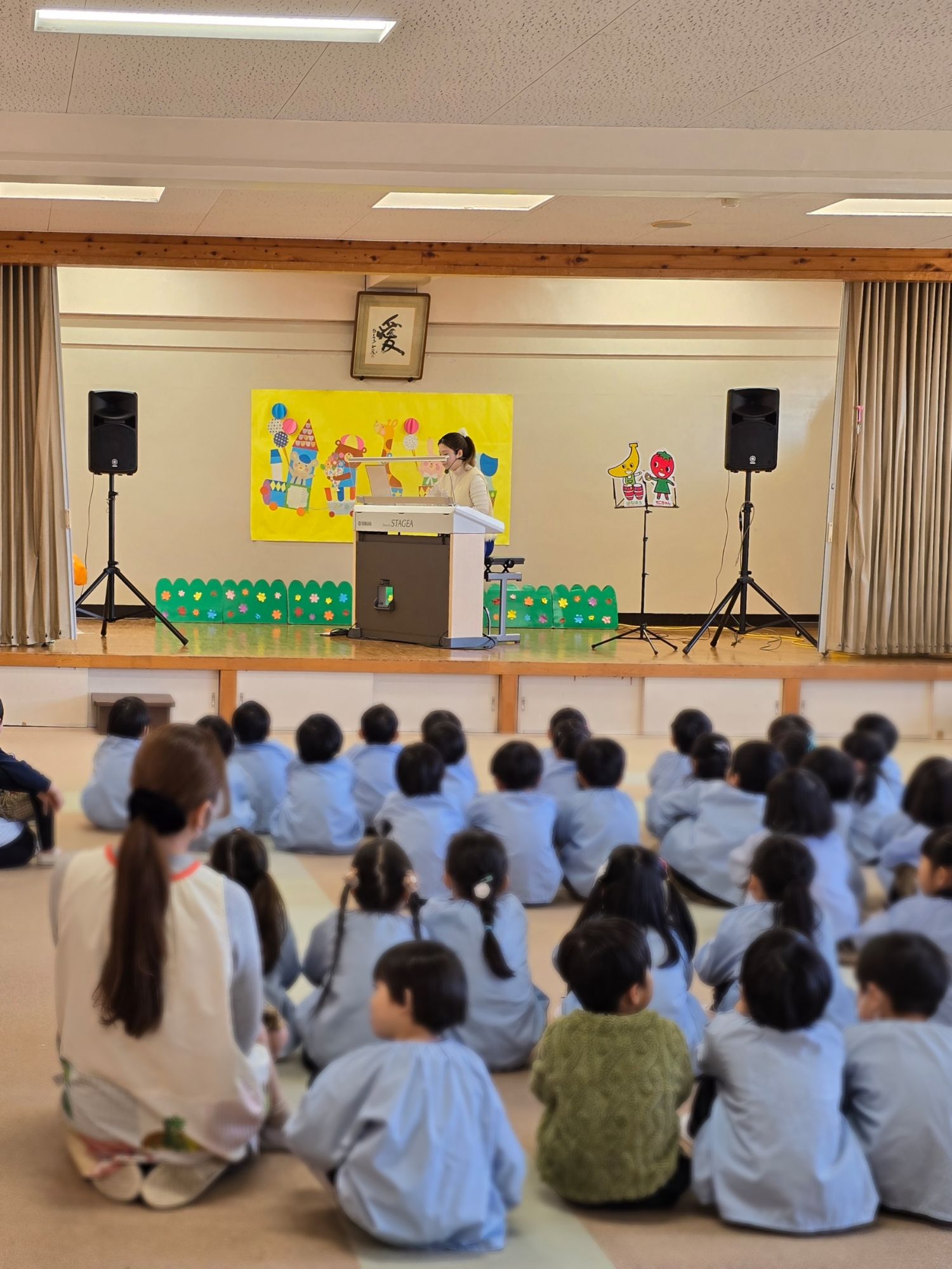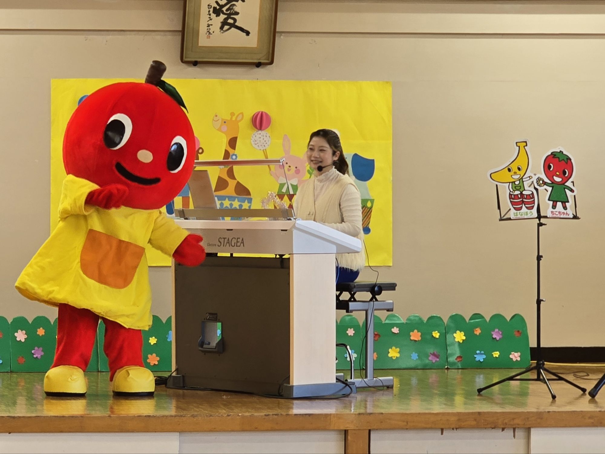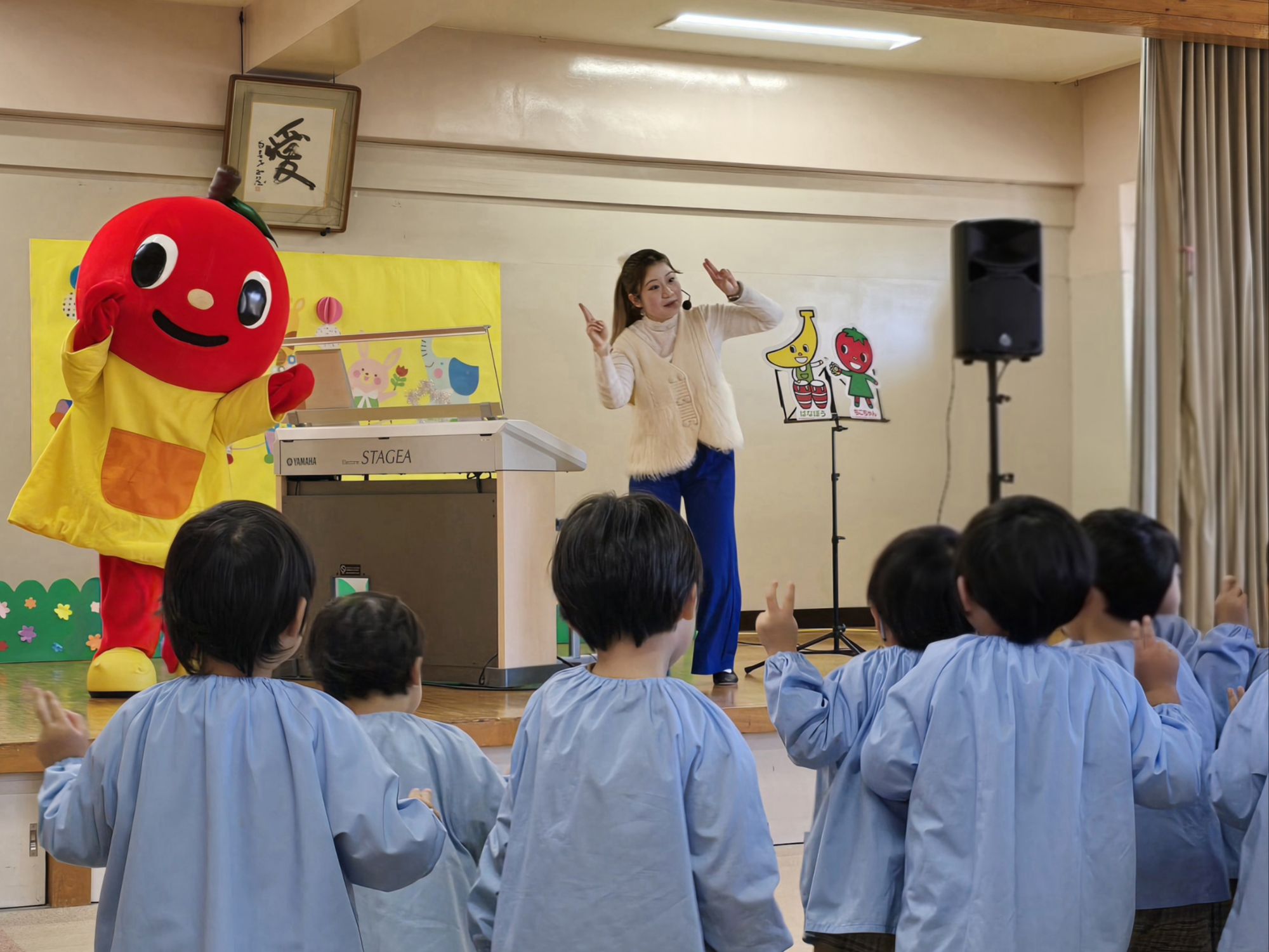 ヤマハのミニコンサートがありました。お姉さんと一緒に歌ったり踊ったり、音のクイズに挑戦したりと、楽しい時間を過ごしました。リズムに合わせて体を動かしながら、音楽の楽しさをたっぷり味わうことができました。お友だちのプップルちゃんも来てくれて、会場は笑顔いっぱい。心弾むひとときとなりました。