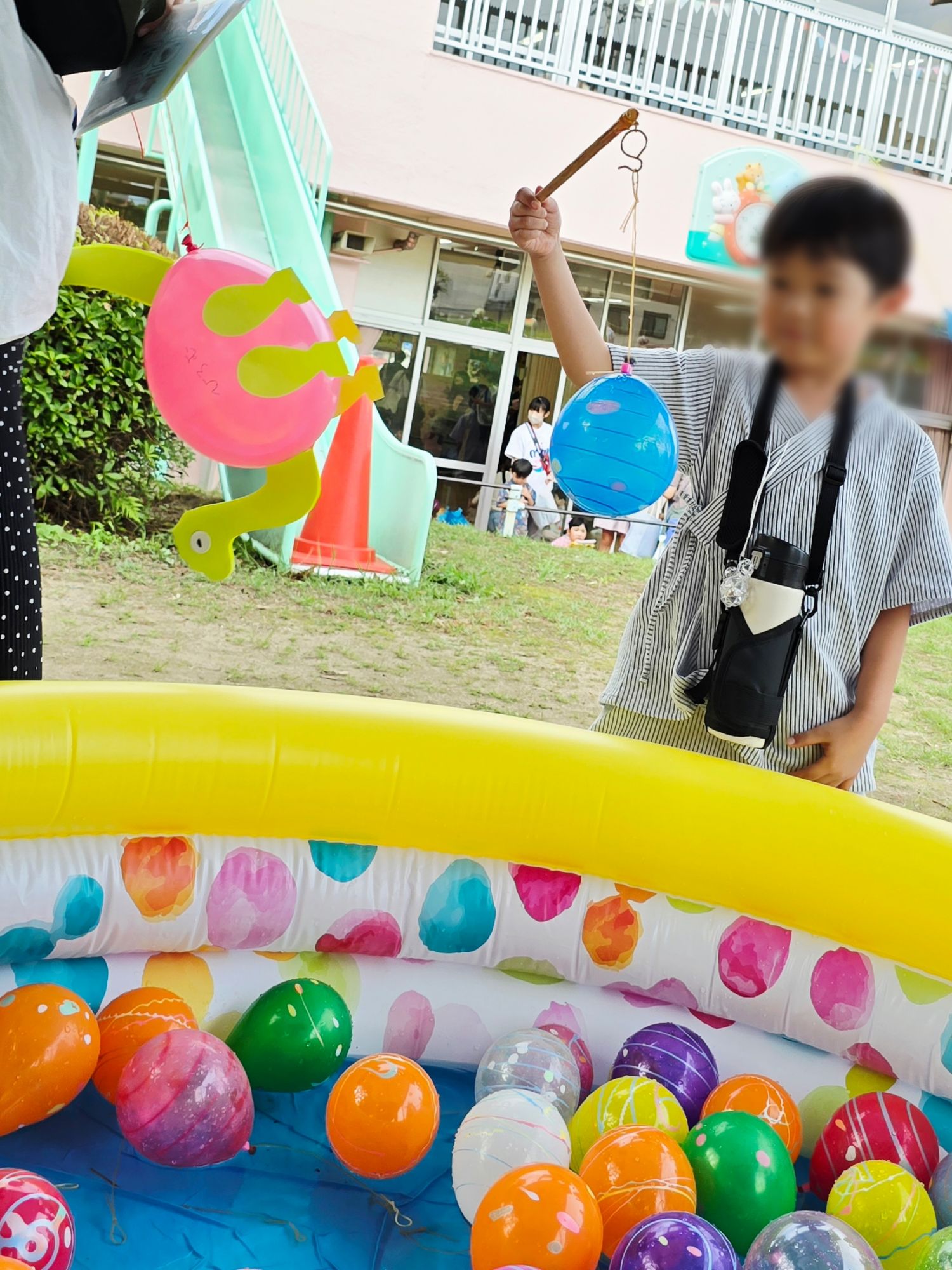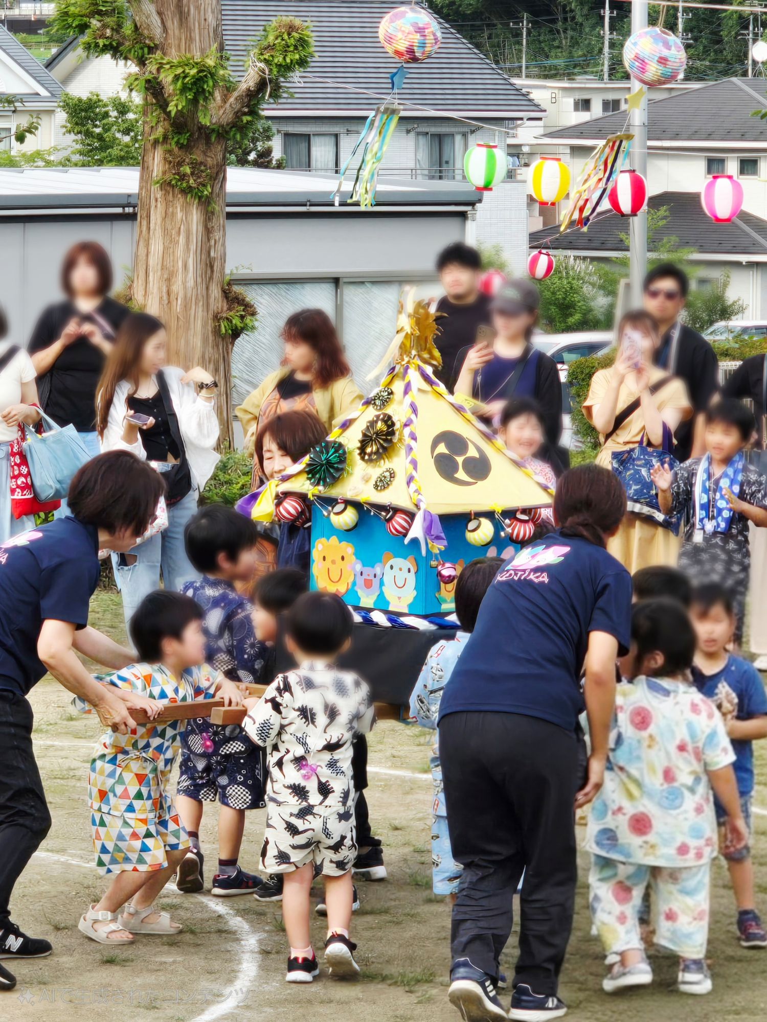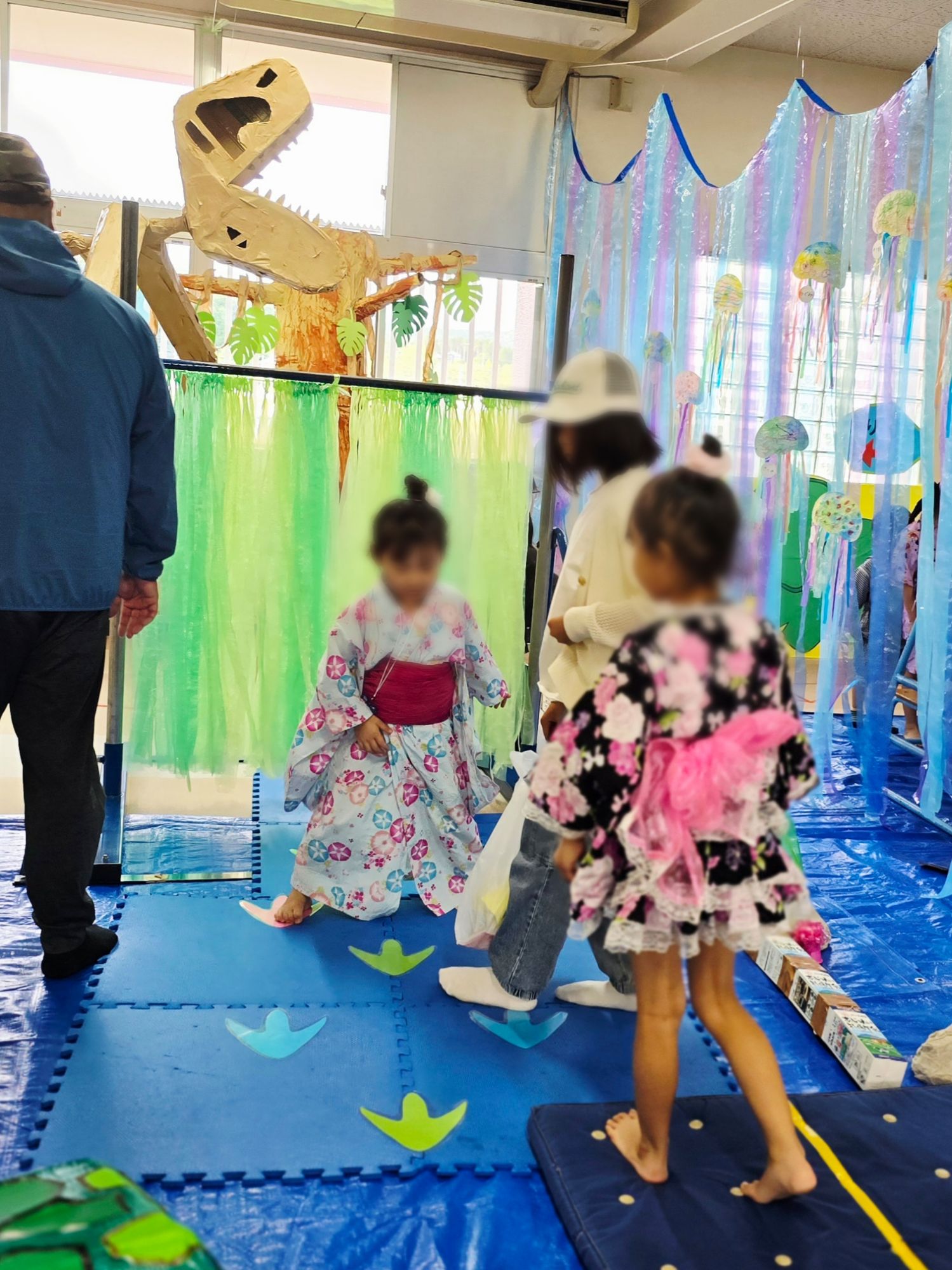 幼稚園で夕涼み会を開催しました。お神輿を元気に担ぎ、盆踊りでは笑顔いっぱいに踊る子どもたち。ヨーヨーすくいや輪投げ、まと当ても大盛り上がりでした。ホールには「博物館迷路」が登場し、子どもたちが作った恐竜や昆虫、水辺の生き物を見ながら、アスレチックを楽しむ姿が見られました。最後には打ち上げ花火を見て楽しみ、夏の思い出がたくさん詰まった楽しい一日となりました。