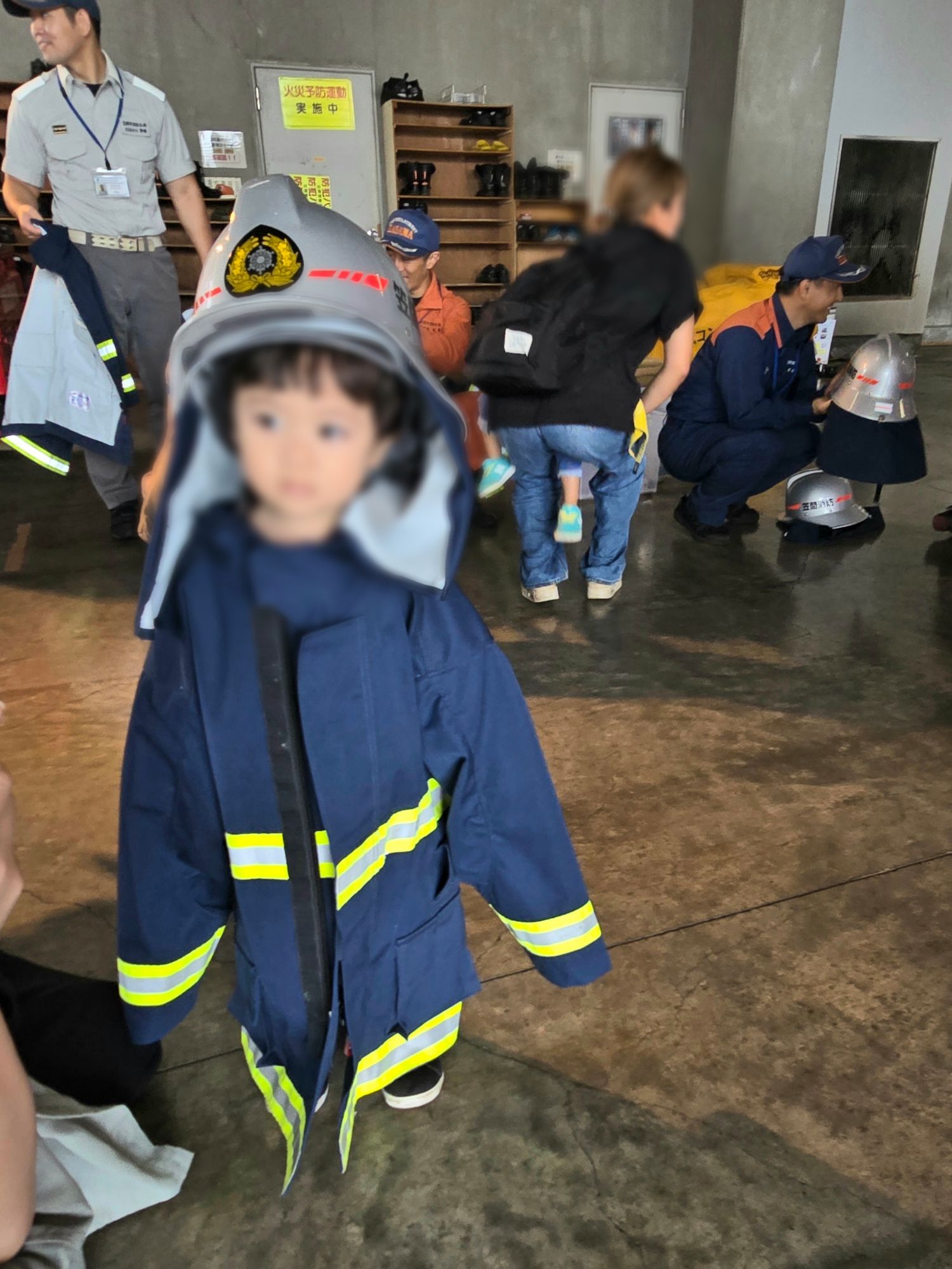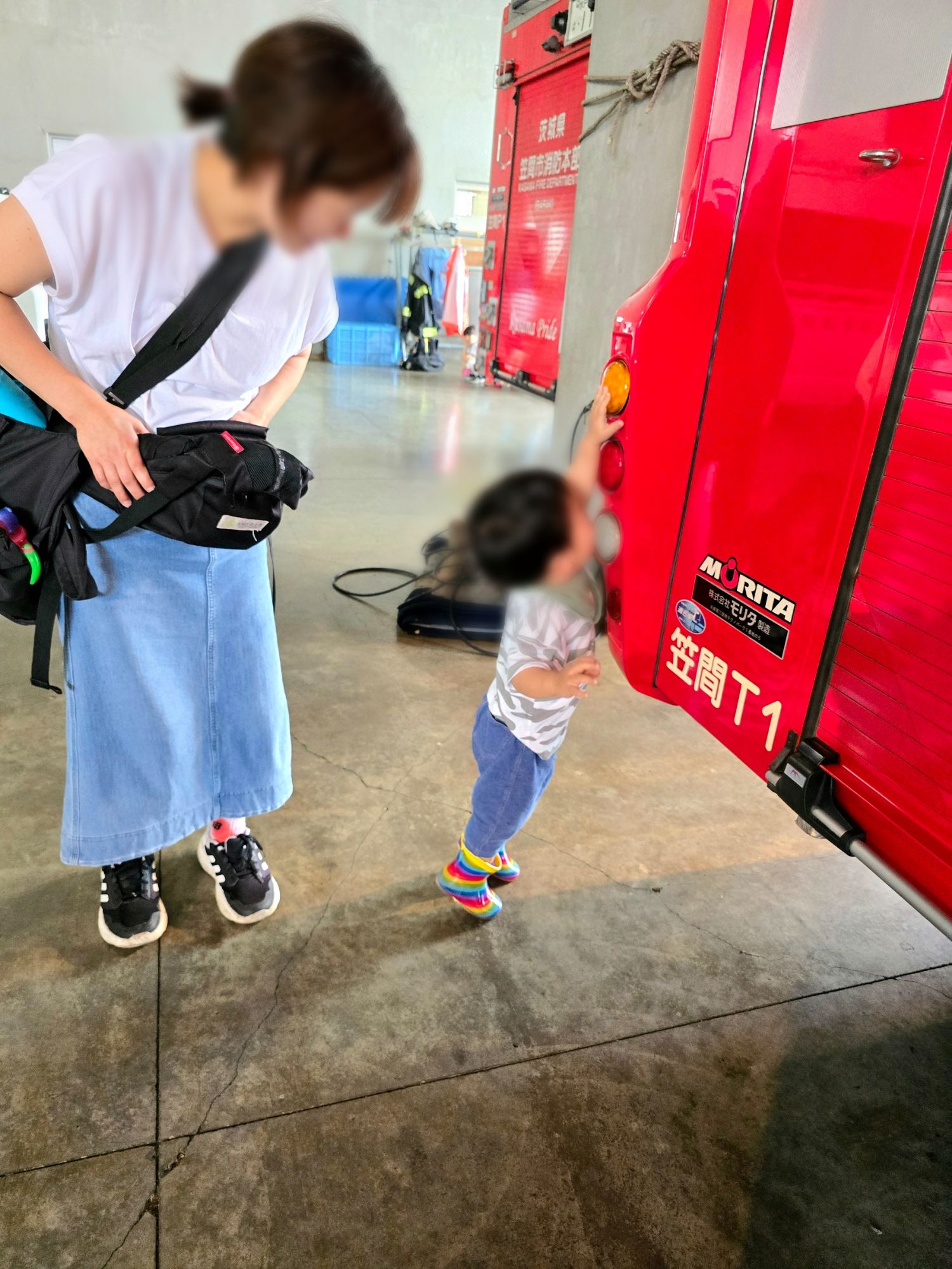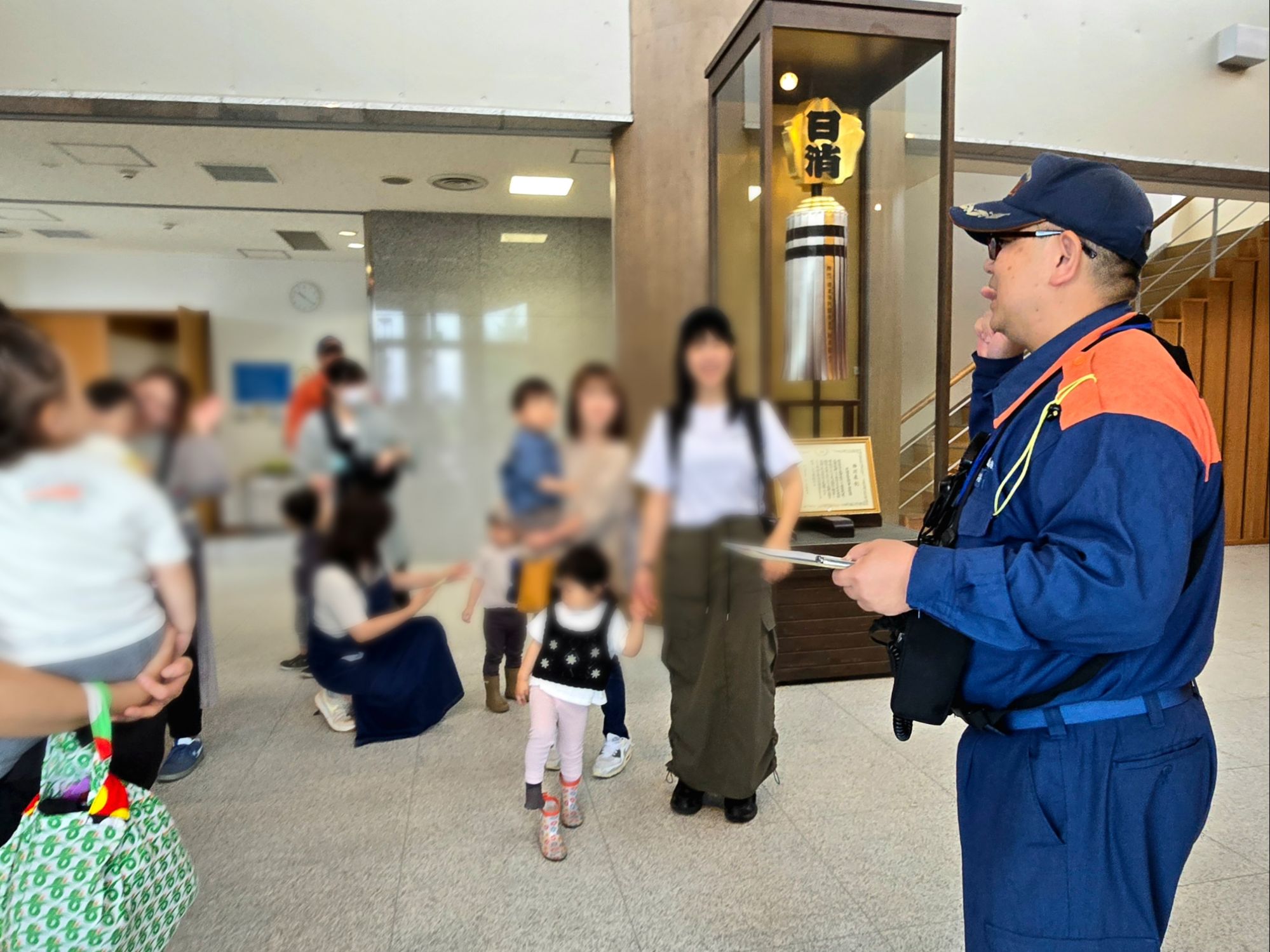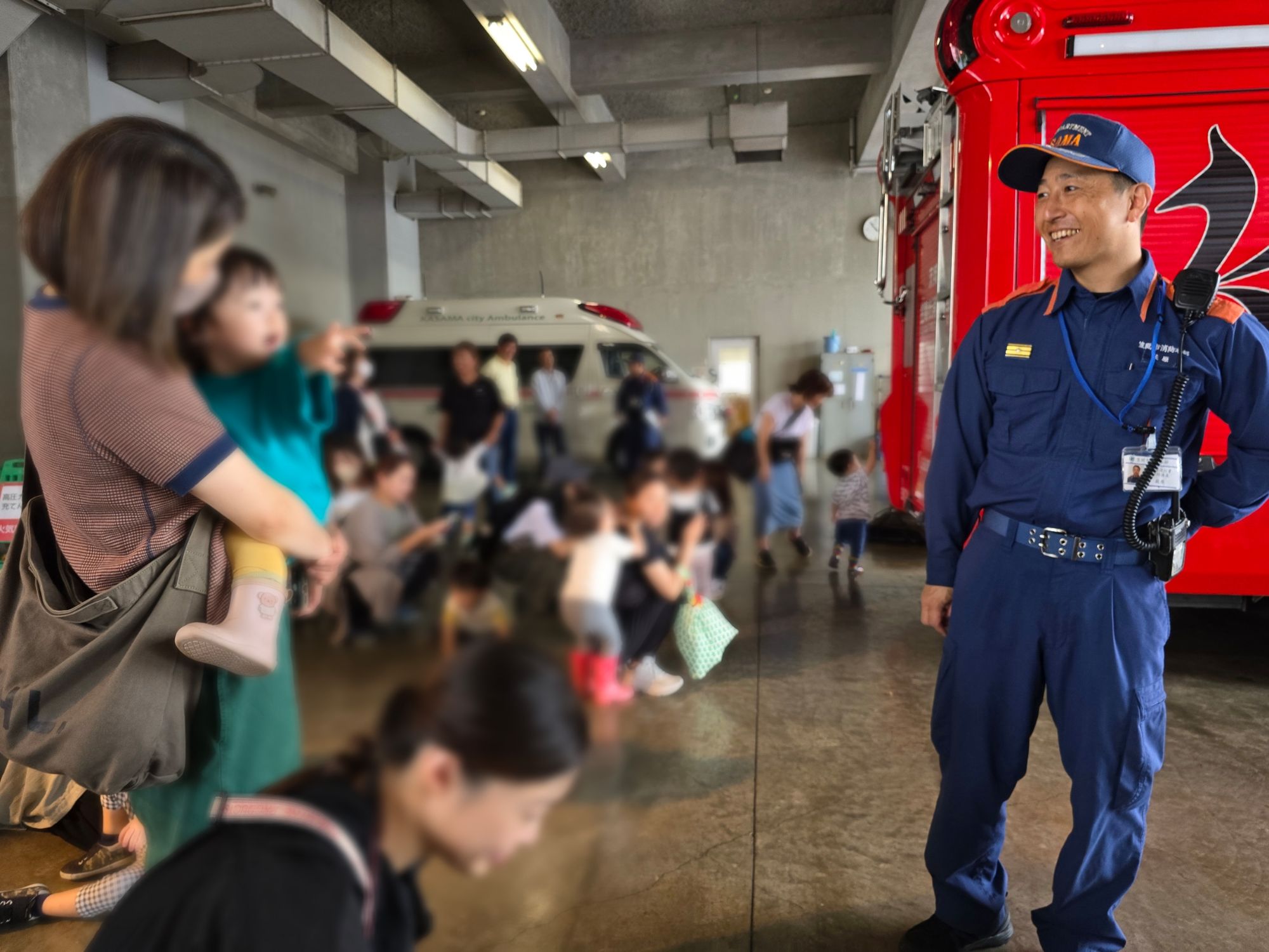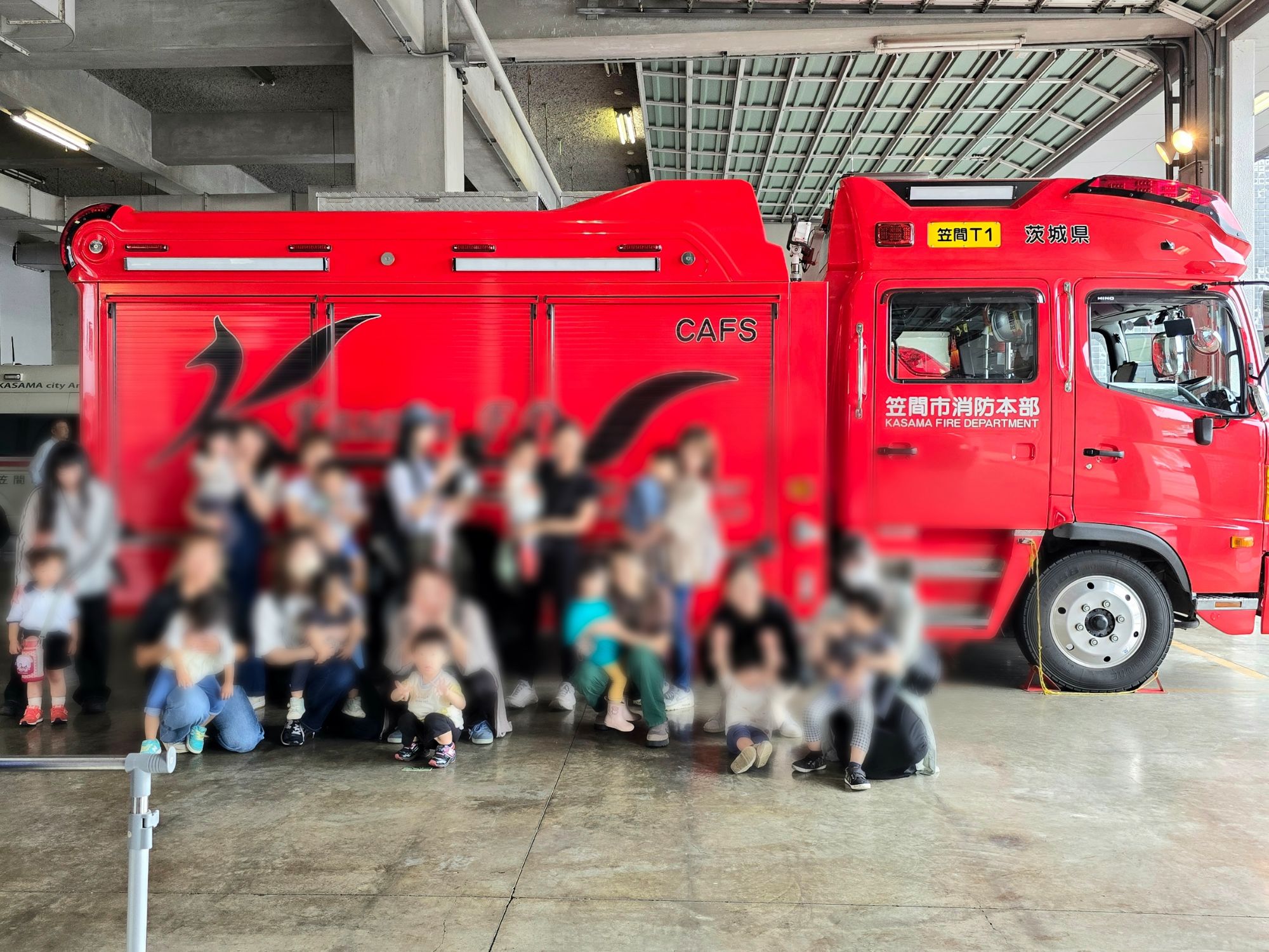 子育て支援教室で消防署を見学しました。大きな消防車を目の前で見て、子どもたちは大興奮!消防士さんの優しい説明や装備体験にも大喜びでした。保護者の方もAED の事や火事時のお話も真剣に聞いていて、貴重な体験になりました。
