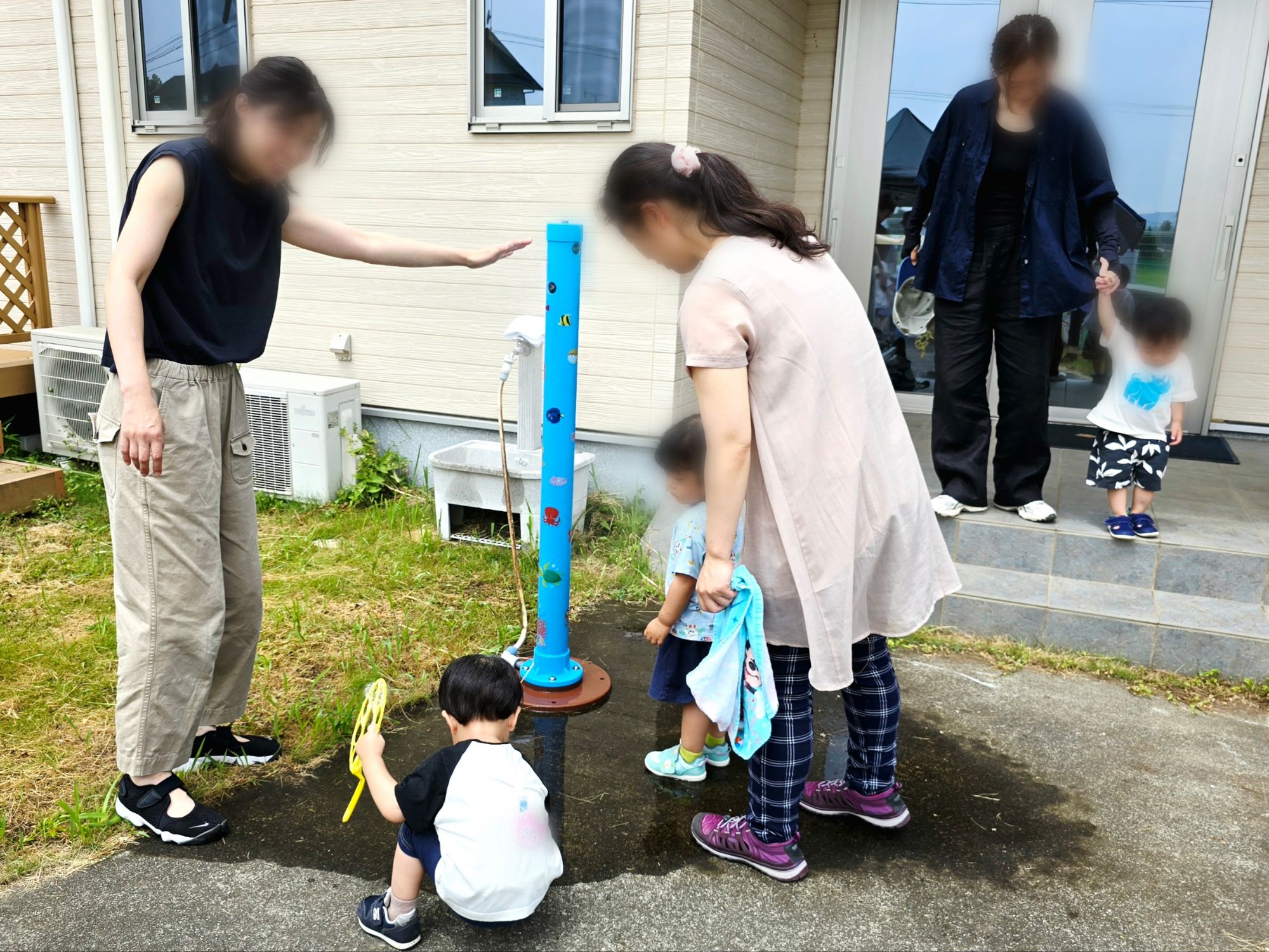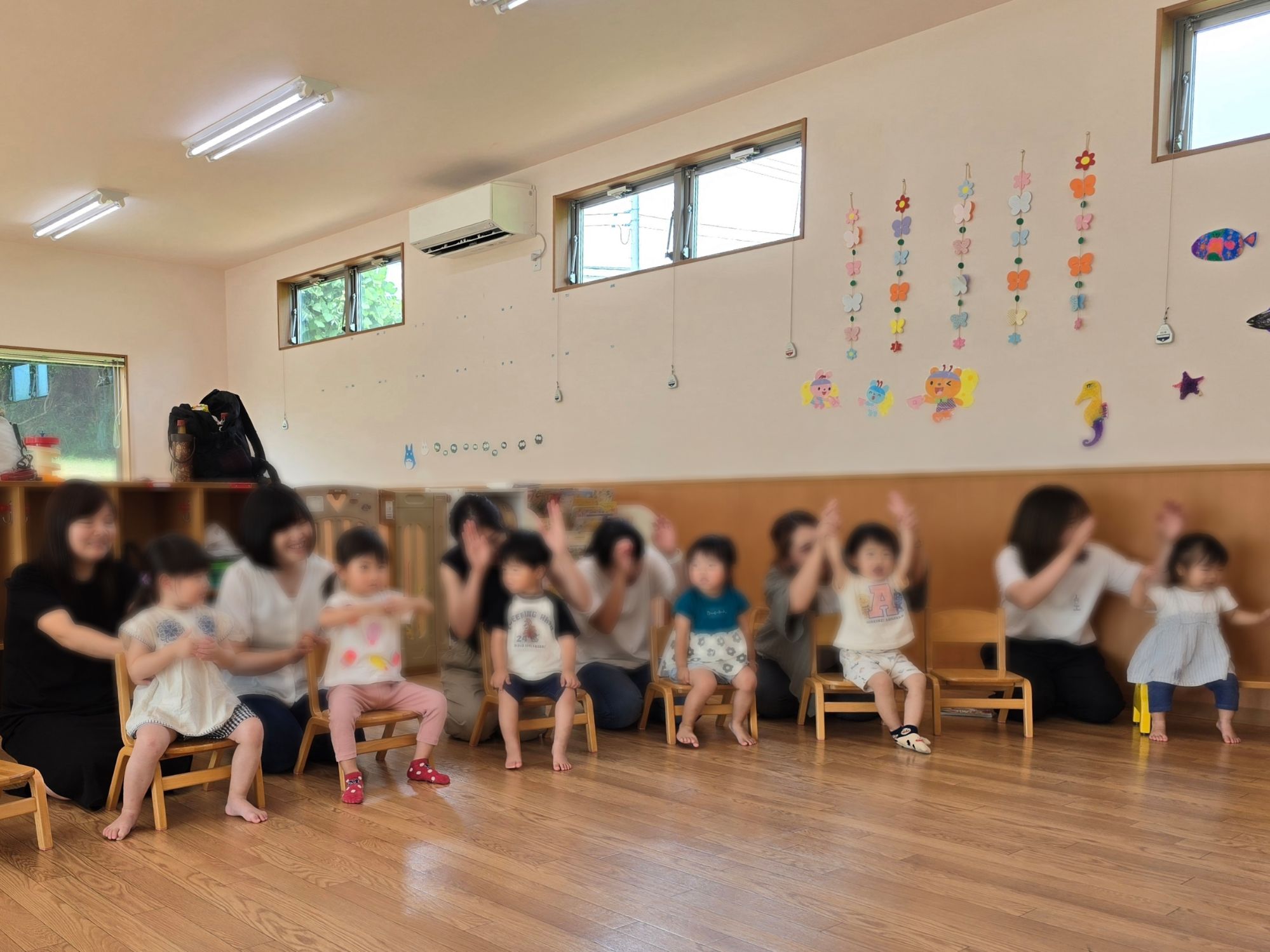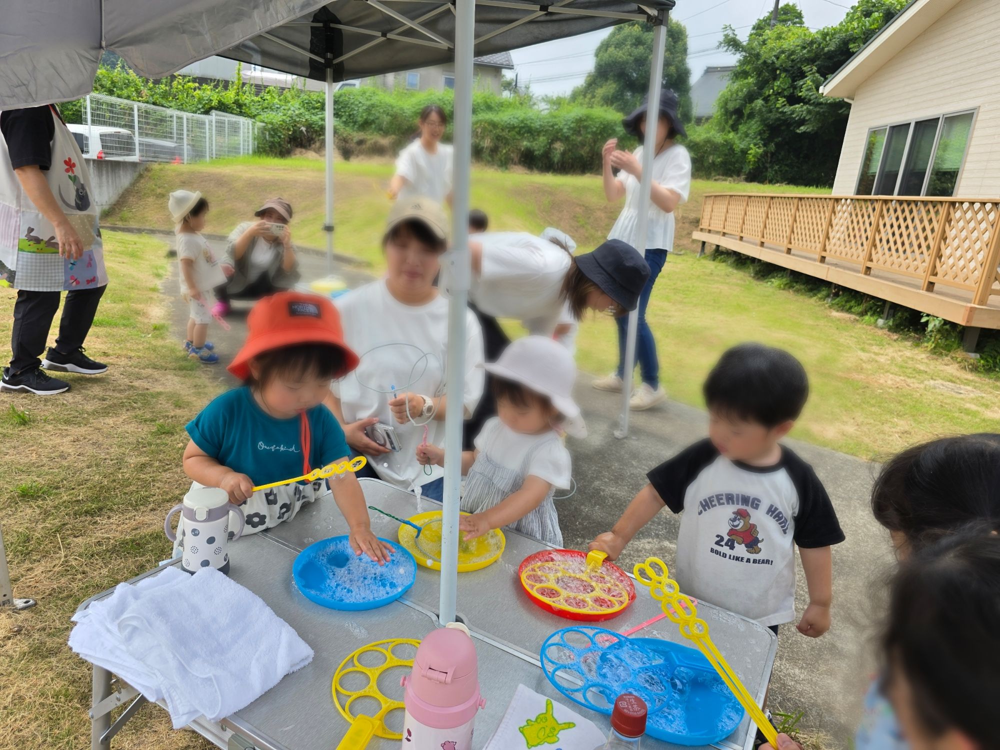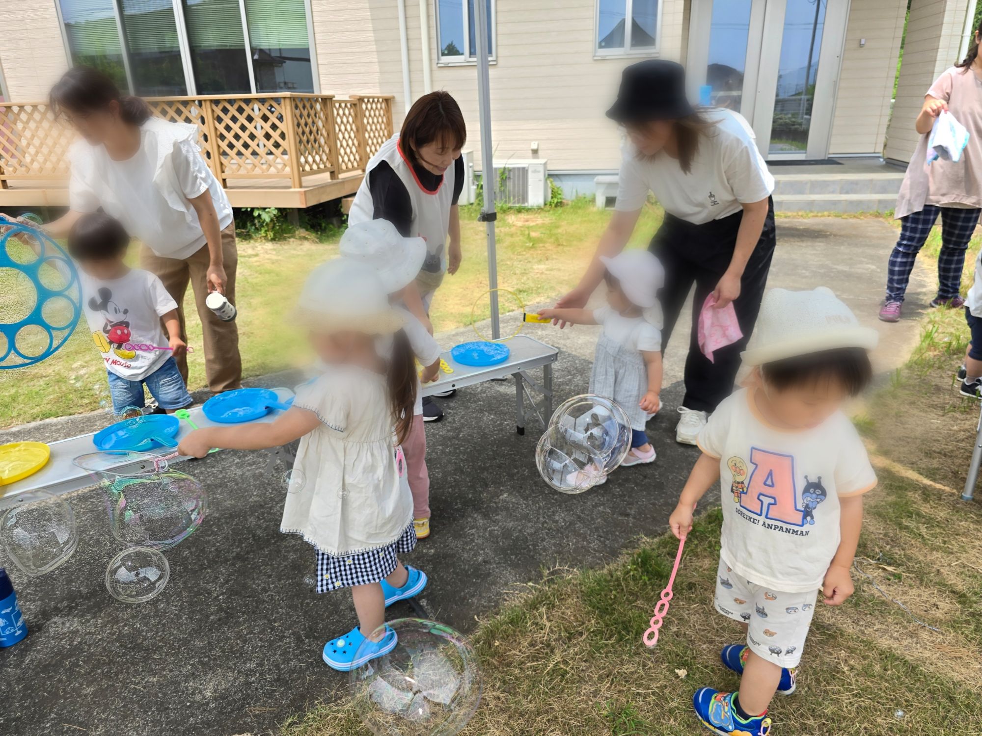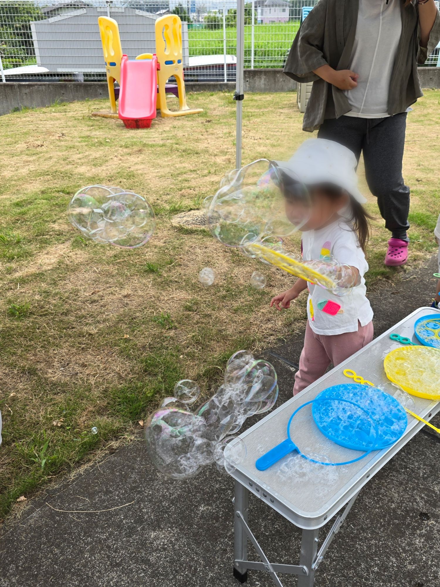 子育て支援教室でシャボン玉遊びを楽しみました。大きなシャボン玉ができると「わあ!」と歓声があがり、たくさんのシャボン玉が空に舞う様子に、子どもたちの笑顔が広がりました。暑さ対策として設置したミストも大好評で、「気持ちいいね」と保護者の方々にも喜んでいただけました。