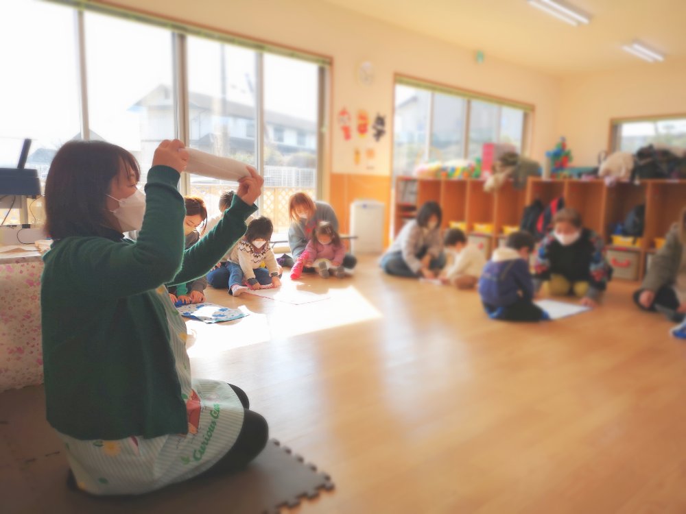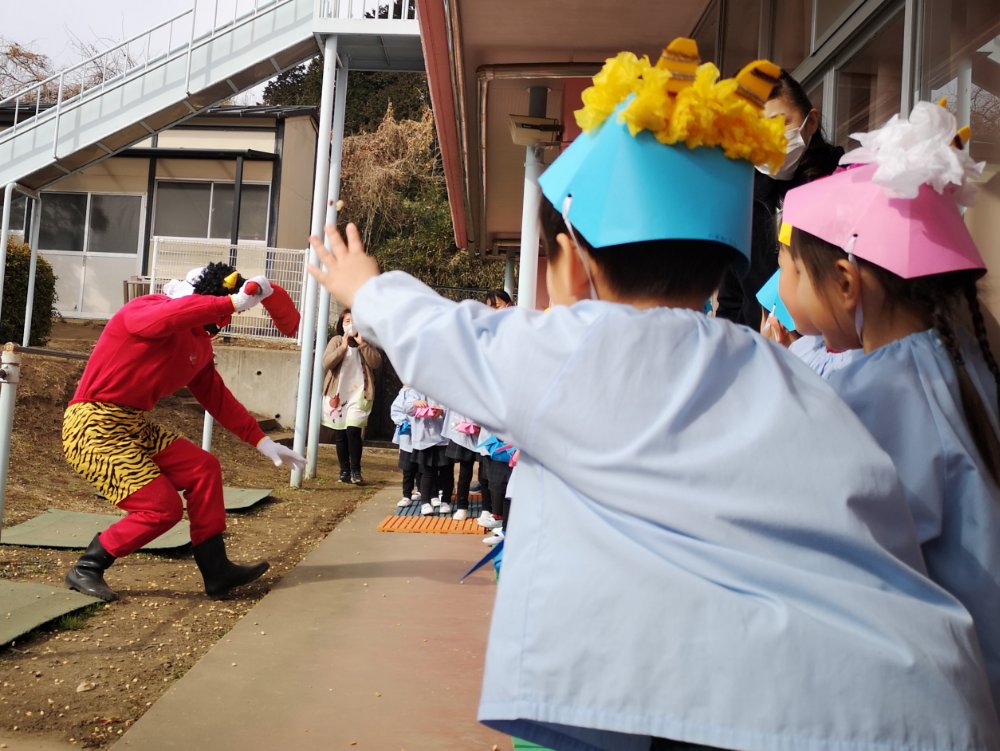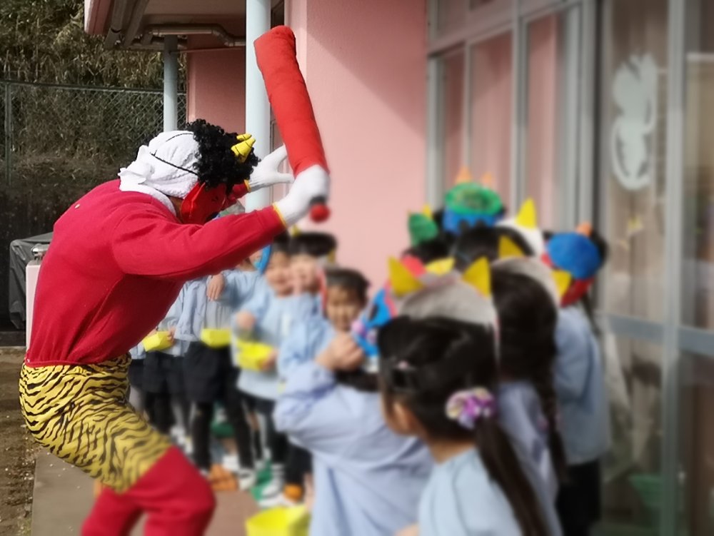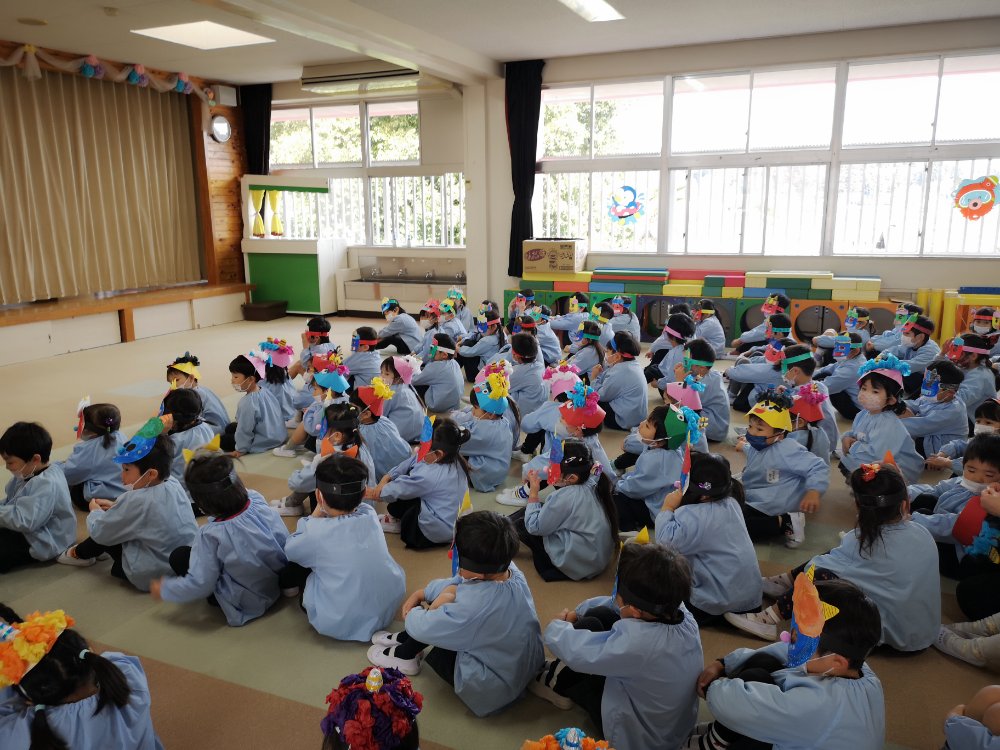 豆まき集会では、自分たちで作った鬼のお面をかぶって、節分の由来を静かに聞きました。