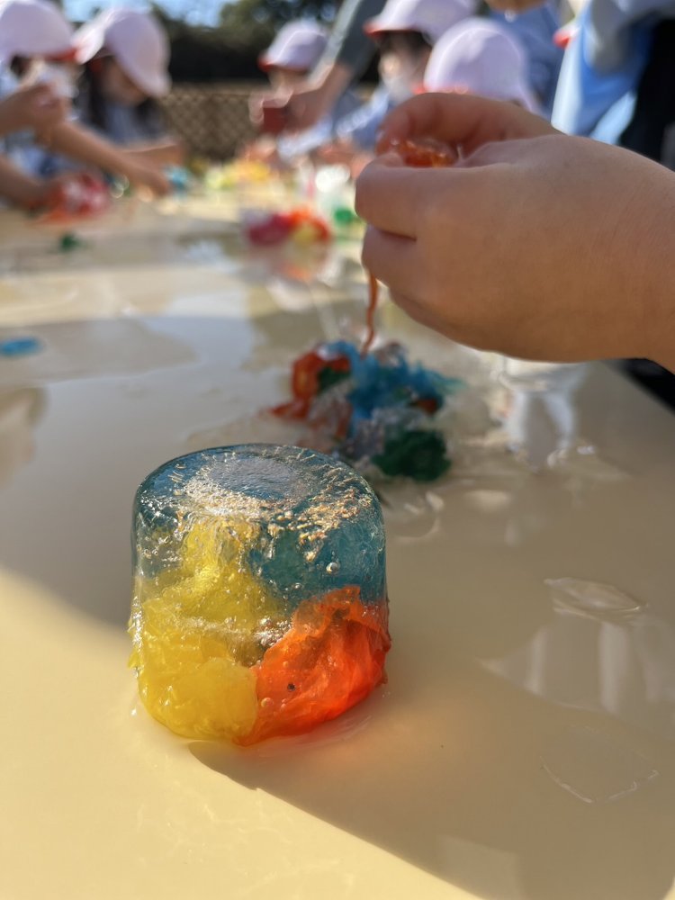 水の入った牛乳パックにお花紙も入れて、前日から外に置いておきました。どんな氷ができるか楽しみにしてました😌