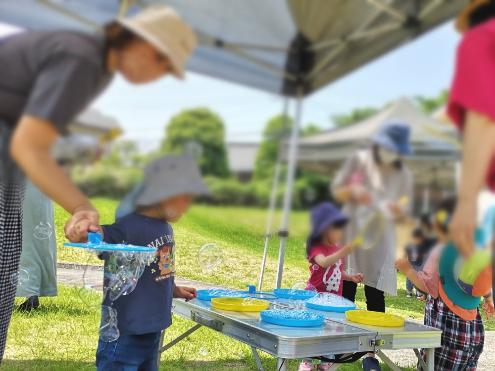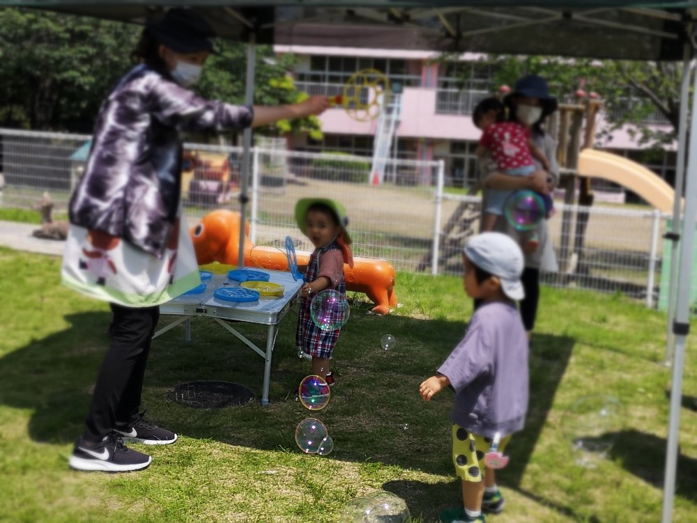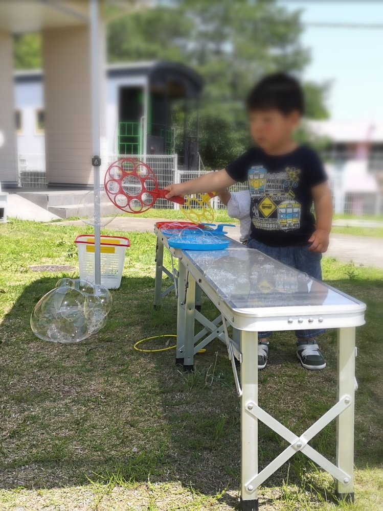 息を吹きかけてたり、輪っかを振ってみたり…たくさん飛んでいるシャボン玉を追いかけたりしました。