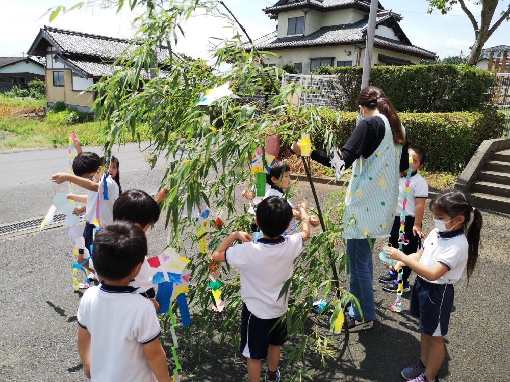 7月7日七夕です。みんなで作ったたなばた飾りとお願いごとの短冊を付けた笹が風に揺れています。集会では織姫彦星のお話を聞きました。みんなのお願いごと…🌟お星さまに届くと良いですね😊