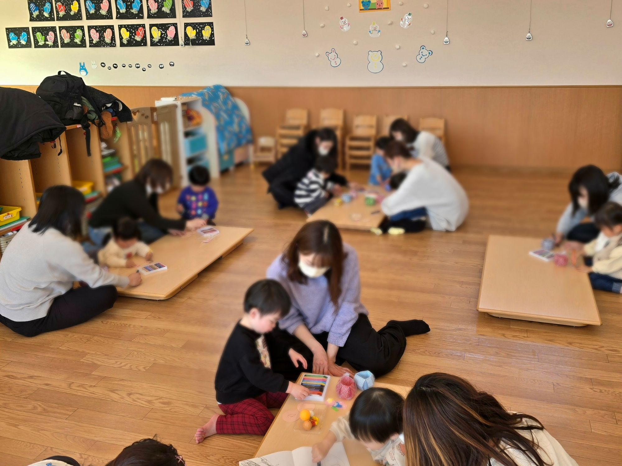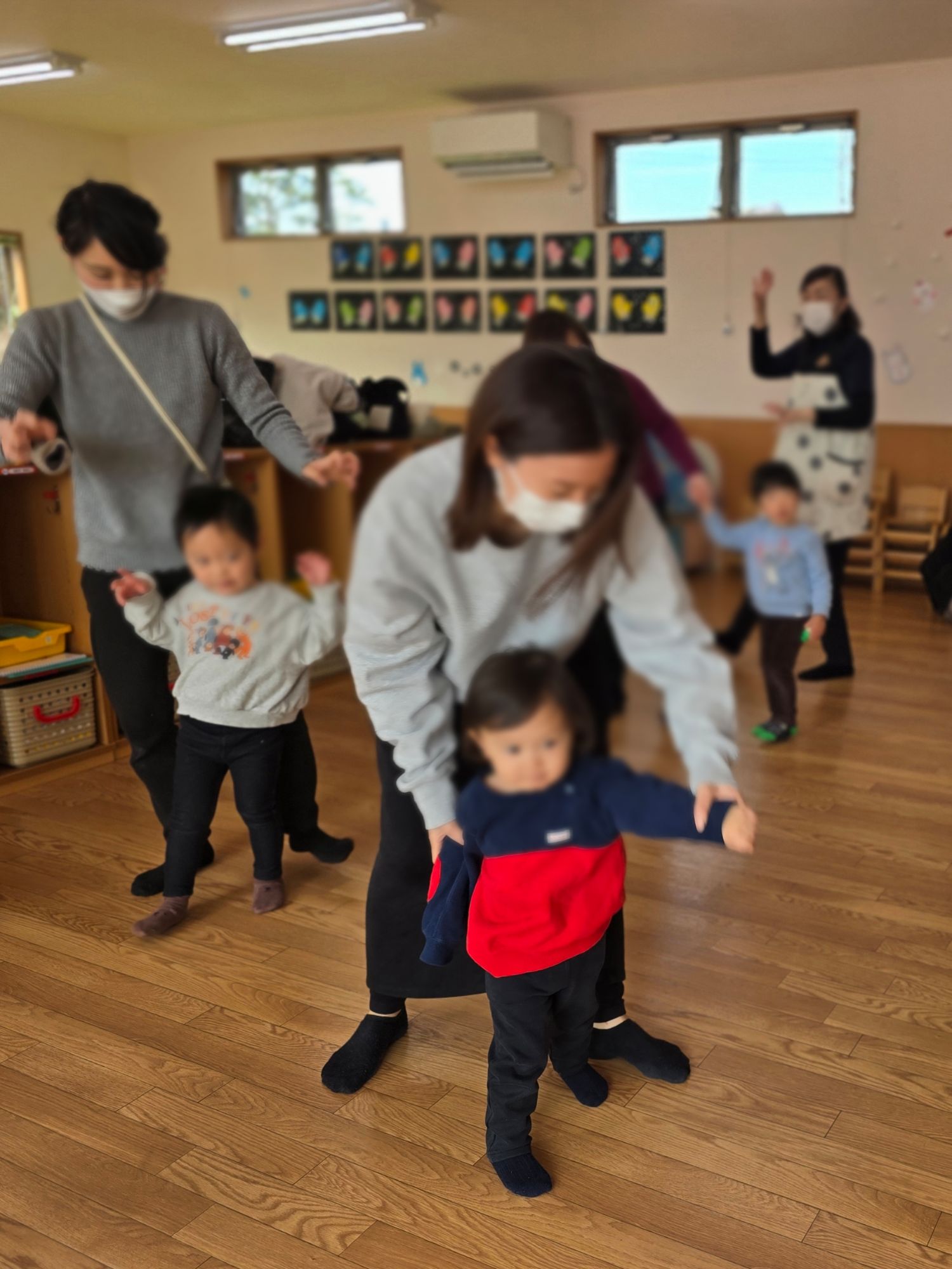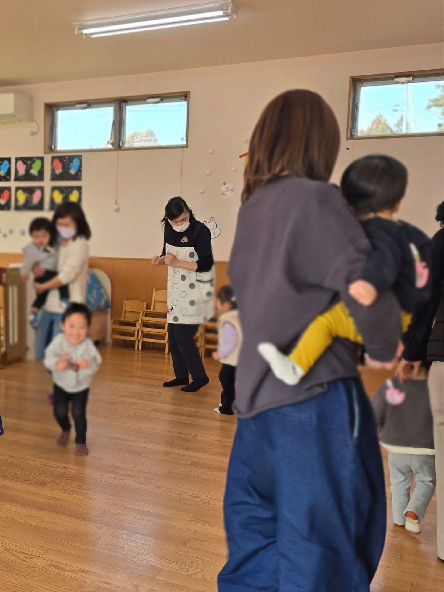 今回はリトミック遊びをしました。動物になりきったり、『さんぽ』の曲に合わせてゆっくり歩いたり速く歩いたり親子で楽しみました。