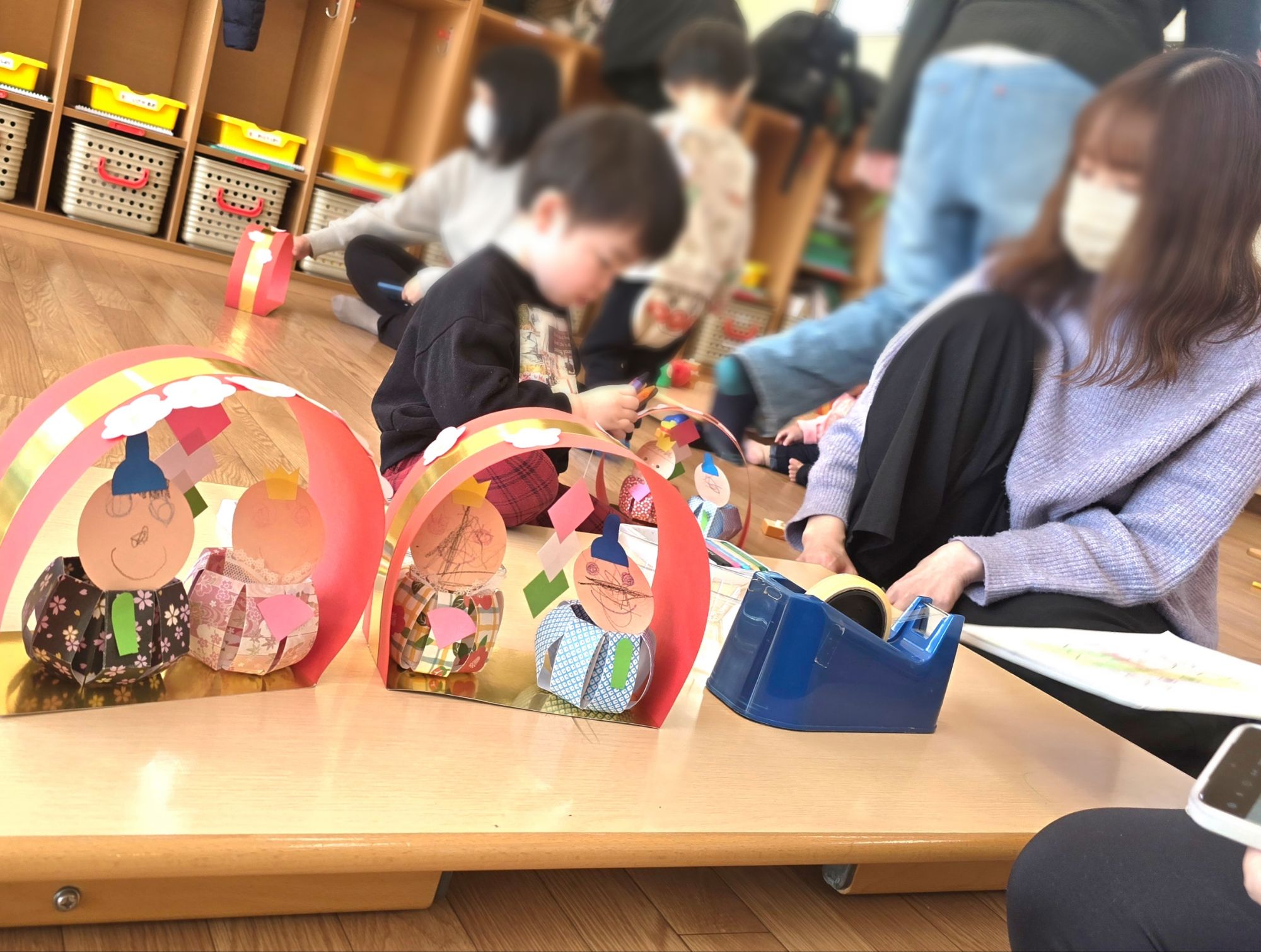 お雛様作りをしました。お内裏様とお雛様の顔を書いてかんむりや烏帽子を付けていきます。周りに桃の花を飾って素敵に出来ました。