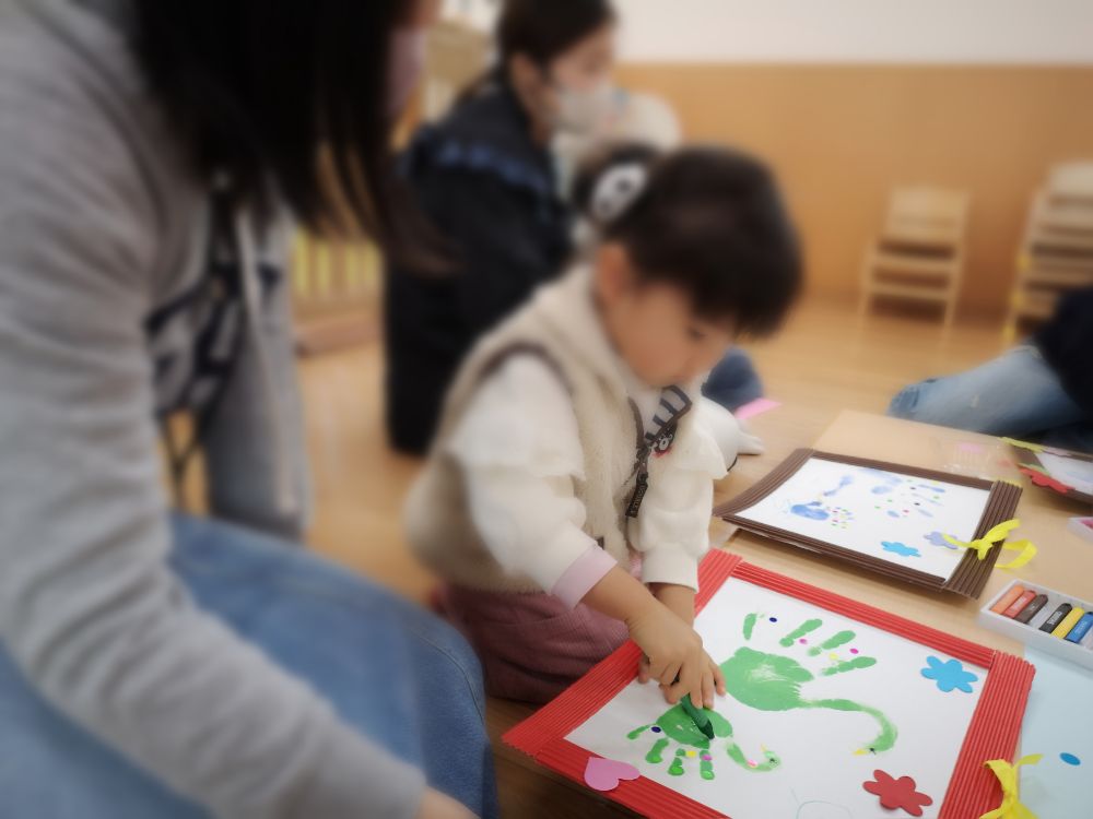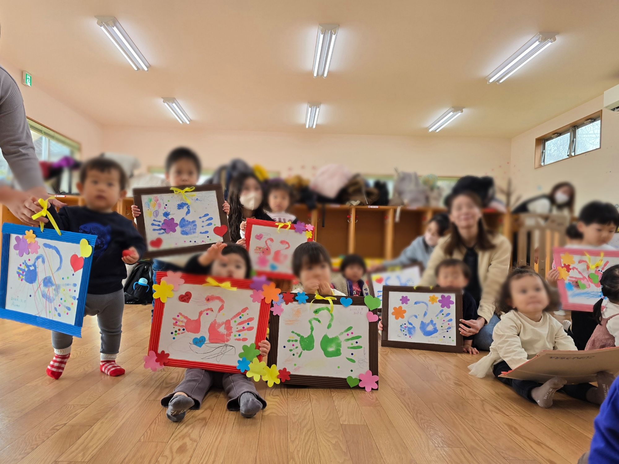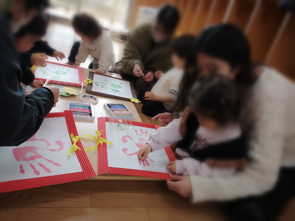 今年度最後の親子教室バンビは親子で手形アートをしました。保護者の手形と小さな手形で2匹の可愛らしい白鳥になりました。とてもステキな作品は成長の良い記念になったことでしょう。