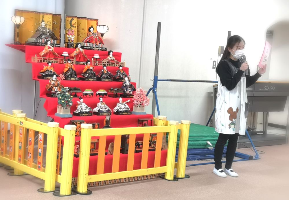 幼稚園に飾られた雛人形を前に、女の子の行事とされる「ひな祭り」はどんなことをおこなう行事なのか由来や意味を先生から教えてもらいました。