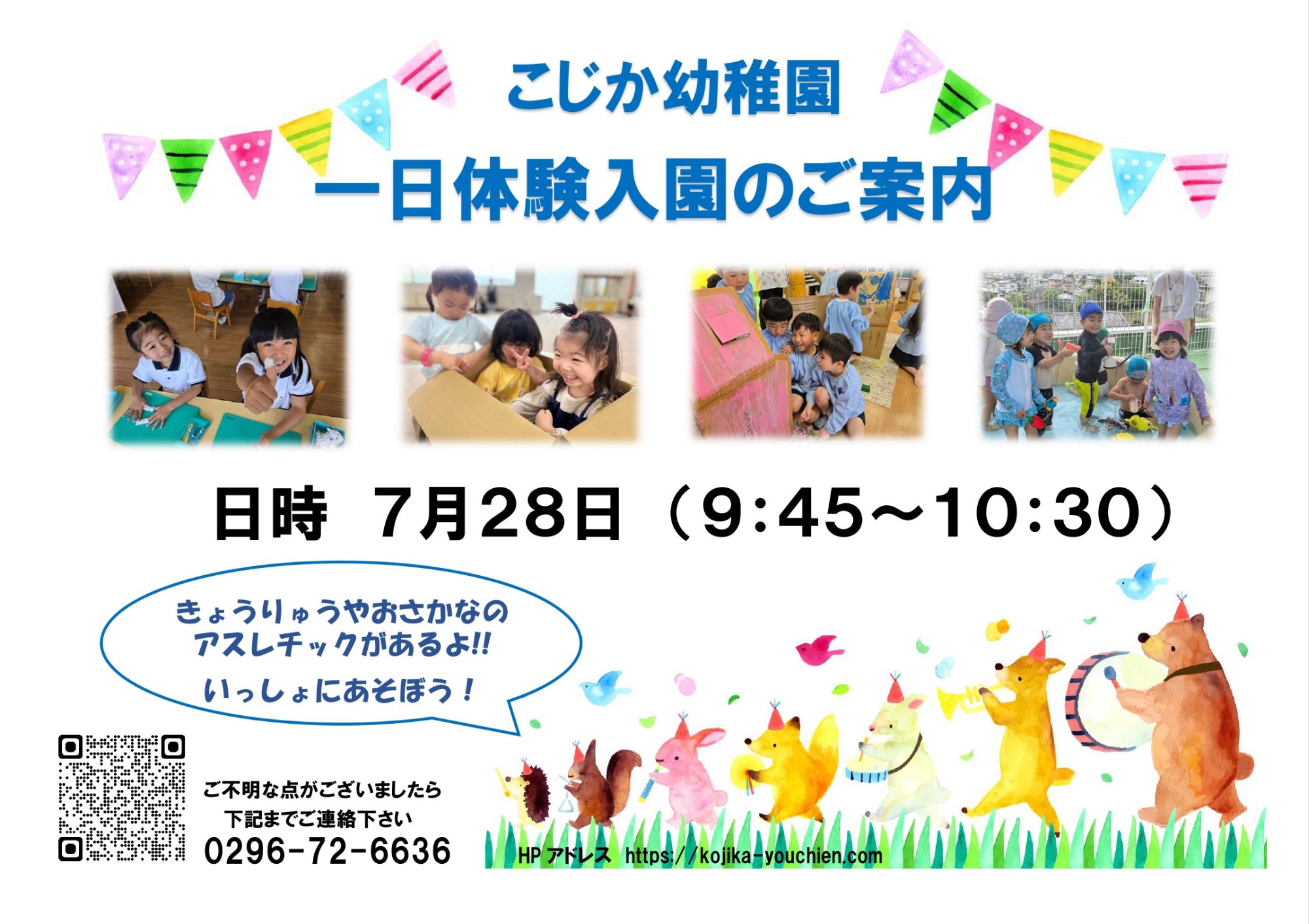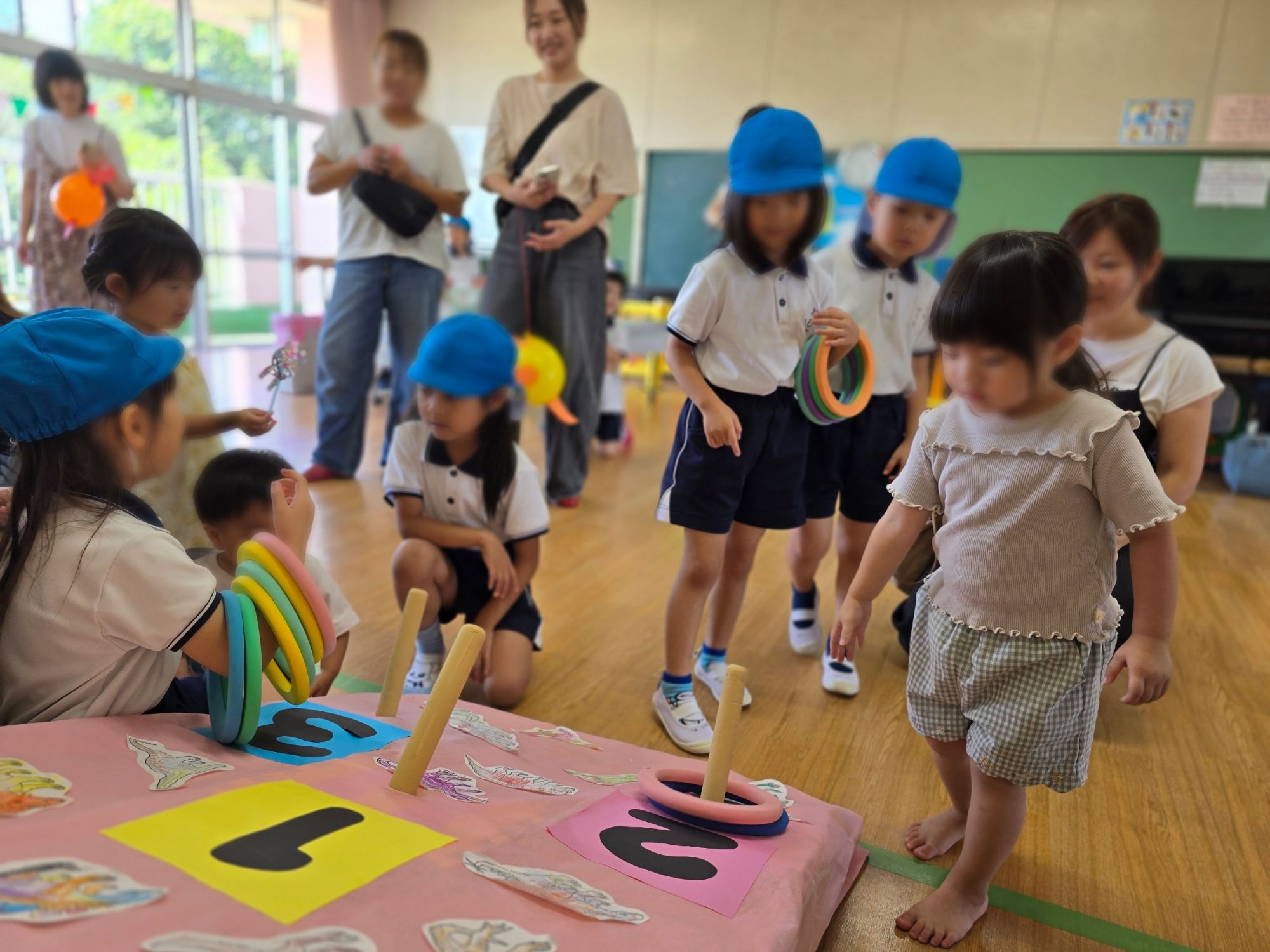 幼稚園で1日体験入園が行われ、たくさんのお友だちが遊びに来てくれました。園内では在園児が作ったかわいらしい製作物を見たり、輪投げや的あてなどの遊びコーナーで笑顔いっぱいに楽しむ姿が見られました。初めての場所にも関わらず、親子でゆったりと過ごす様子が印象的でした。園の雰囲気を実際に感じていただける良い機会となり、保護者の皆さまからも「楽しかった!」との声をいただきました。